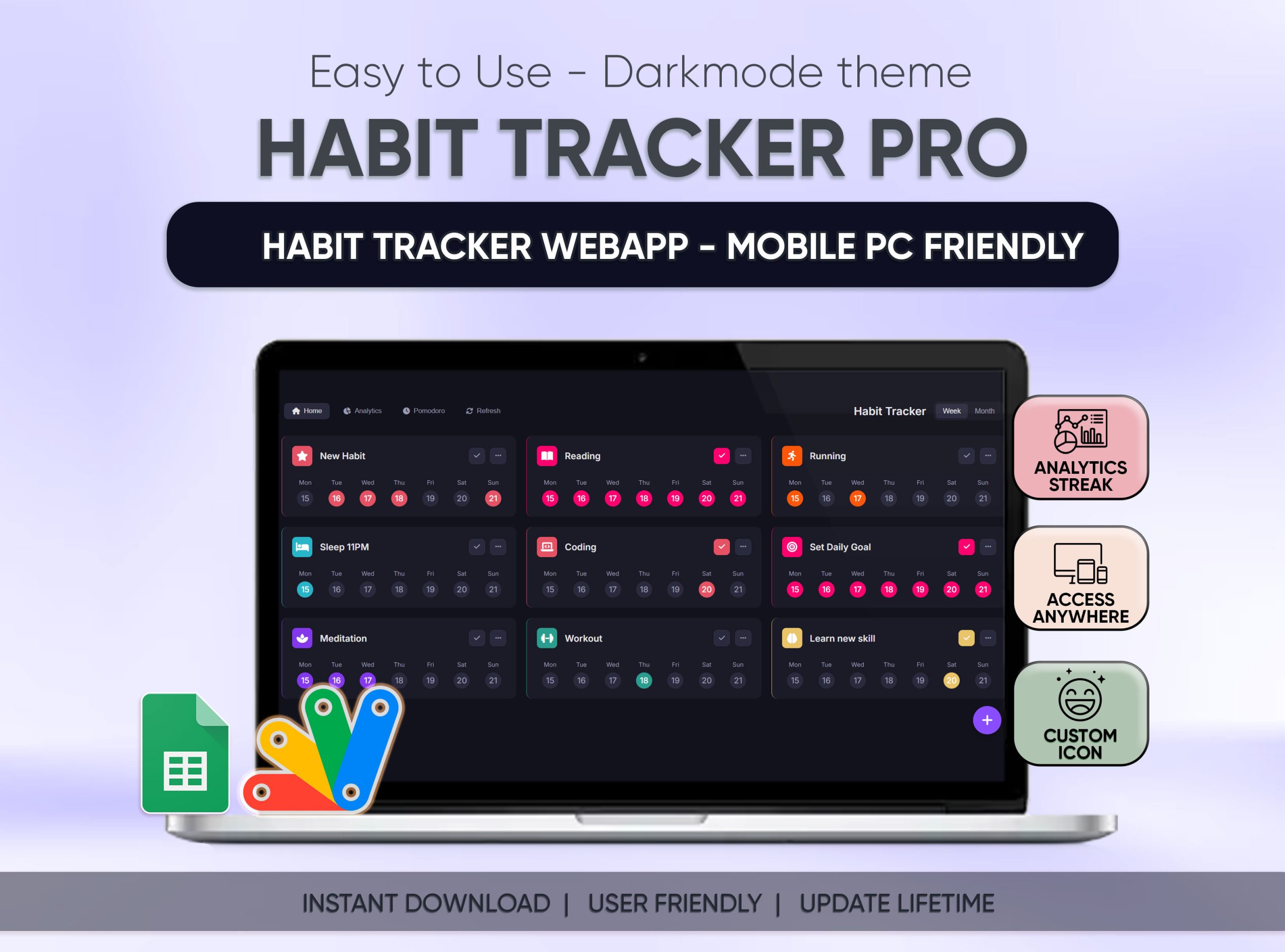 • Instant Download: Get immediate access to the Google Sheet file containing the powerful Habit Tracker Pro AppScript.