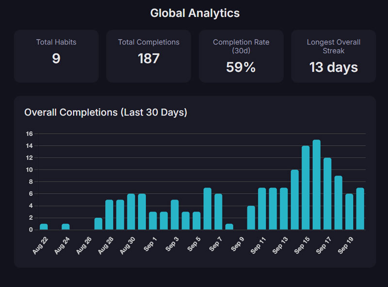 • Powerful Analytics Dashboard: Move beyond basic tracking. The Global Analytics dashboard provides a high-level view of your entire journey, showcasing your total completions, 30-day completion rate, and your longest overall streak to keep you inspired.