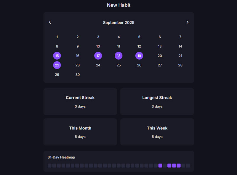 • In-Depth Habit Insights: Dive deep into each habit. Analyze your performance with a detailed calendar view, current and longest streak counters, and a 31-day heatmap that reveals your patterns of consistency.