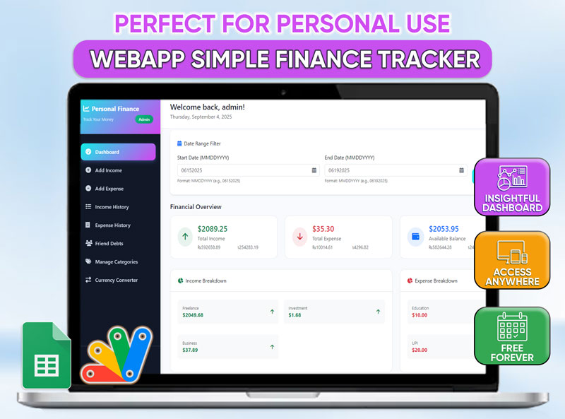 Take control of your financial future with our comprehensive Personal Finance Tracker WebApp v1.0 – a powerful, completely FREE money management solution built with Google Apps Script technology. This professional-grade financial management system offers everything you need to track, analyze, and optimize your personal finances.