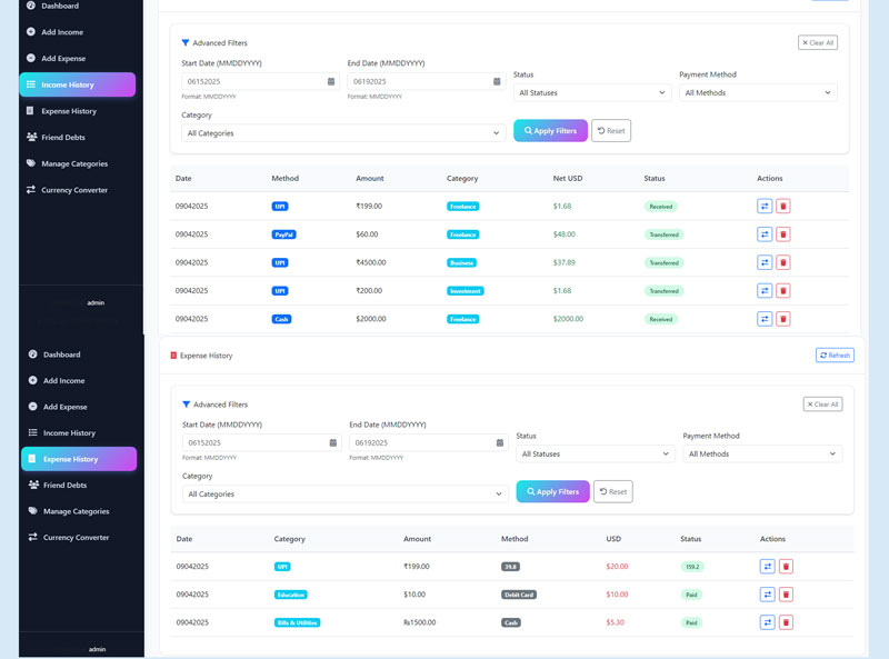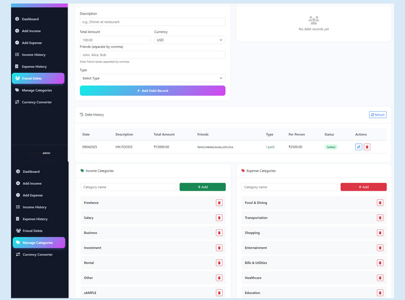 - Monitor expenses across multiple categories (Food & Dining, Transportation, Bills & Utilities, Healthcare, Education, Entertainment, Shopping)